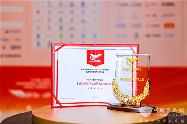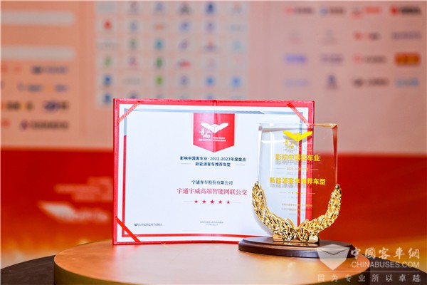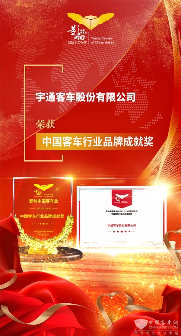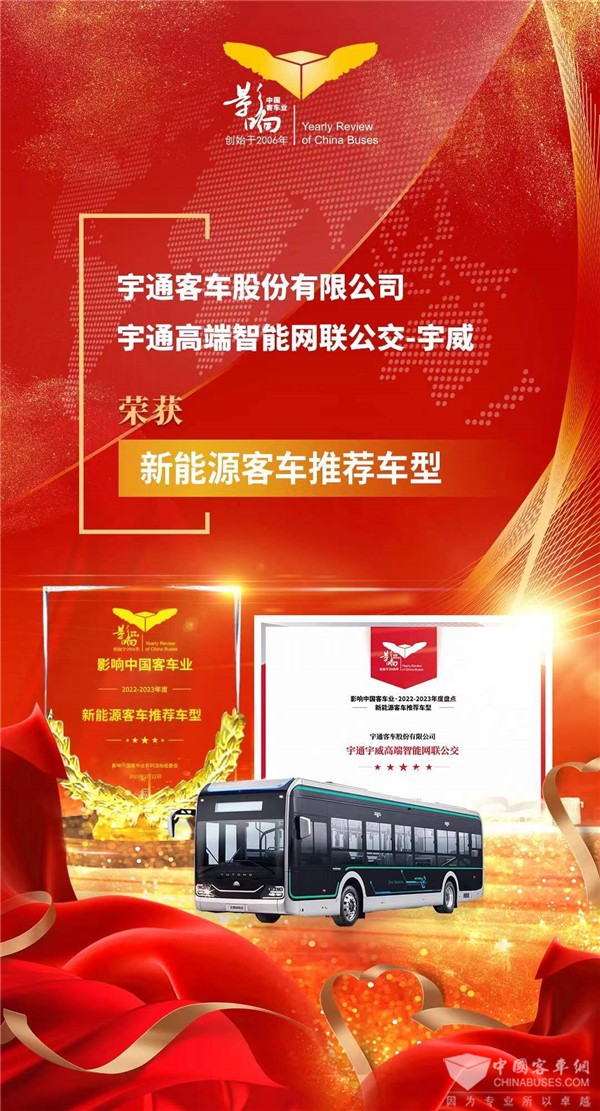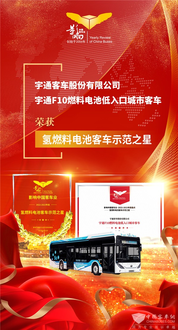 2023年2月22日,第17届影响客车业年度盘点颁奖典礼在南京举行。宇通客车成功蝉联“中国客车行业品牌成就奖”,宇通F10燃料电池低入口城市客车荣获“氢燃料电池客车示范之星”,宇通宇威高端智能网联公交摘得“新能源客车推荐车型”。