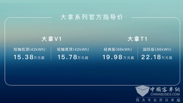 2023年9月21日,上汽大通MAXUS新能源轻型车品牌“大拿eDeliver”正式发布,以“大拿”为名打造成为集智能开发、科技研发、服务创新为一体的新能源轻型车领军品牌;新品牌之下的首个“全球纯电智慧轻型车架构平台”MILA也正式推出,凭“超强技术底座”推动旗下高品质新能源轻型车加速落地;同时,基于该平台打造的首款车型大拿V1、大拿T1同步震撼上市,以划时代的“全维度创新”产品力刷新全球新能源轻型车“天花板”。大拿V1售价15.38万元起,为用户带来贴薪礼、新咖礼、躺赢礼等六重好礼;大拿T1售价19.98万元起,同样为用户带来贴心礼、省心礼、安心礼等六重好礼。双车齐发、双管齐下,上汽大通MAXUS“大拿”助力用户成为“面子大拿”和“赚钱大拿”、“省心大拿”和“财富大拿”,丰富的“炙手好礼”更让用户购车、用车、售后无忧。全球新能源轻型车新时代已到来,上汽大通MAXUS立足多年的技术积淀,全新品牌、全新平台、全新车型“大招齐放”,为“全球新能源轻型车领导者”再添有力证明。