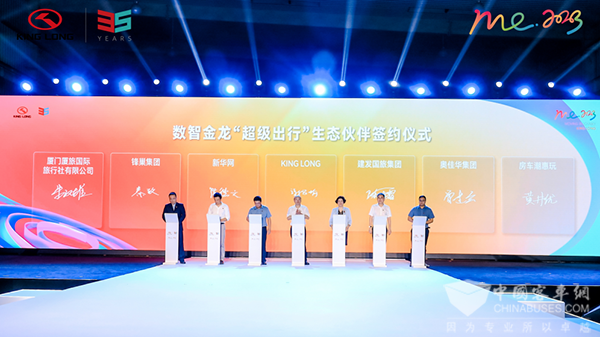 推动中国汽车自信、民族自信,让智慧出行融入生活不能只依靠一家企业单打独斗,与合作伙伴携手共进、互利共赢才能不断发展壮大。在大会现场,厦门金龙汽车集团董事长谢思瑜与新华网福建分公司总经理陈德文、建发国旅集团董事长陈丽霜、锋巢集团董事长秦致、奥佳华集团总裁特助曾建宝、厦门厦旅国际旅行社有限公司总经理朱汉雄、房车潮惠玩董事长黄井优等合作伙伴进行了集中签约仪式,未来将继续深化相关合作,携手共创美好出行未来。