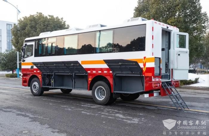 据悉,这批油田特种客车共45台,主要服务于油田测井相关作业,车长8.55米,车宽2.5米,车高3.5米,裙边离地高度54厘米,车辆爬坡能力超过45%,车辆为三舱结构,分前舱、中舱、后舱,前舱设驾驶区以及8个座椅,中舱设仪器区及休息区,后舱为仪器及工具收纳区,更合理更实用地满足油田测井人员的交通、休息、作业等需求。
