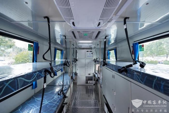 中舱每个床铺均配备2根安全带,防止人员、物品等坠落,每个床铺均配备独立插座,可以为手机、平板电脑等充电;顶部设置晾衣绳固定支架,为人员生活提供便利。