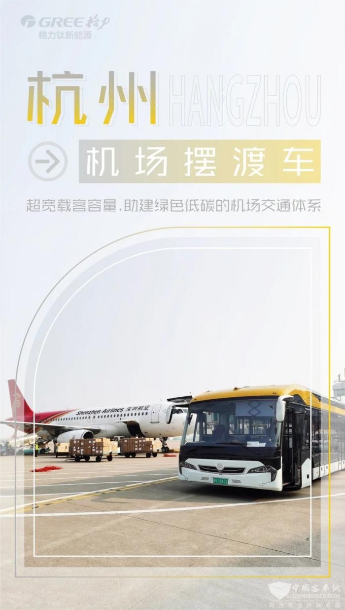 格力钛新能源14米机场摆渡车,具有120人超宽载客容量,在杭州萧山国际机场为旅客提供摆渡接送服务,保证机场运输方式之间衔接顺畅,助建绿色低碳的机场交通体系。