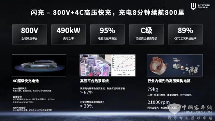 对于新能源汽车品牌都在讲的超充技术,创维汽车深度挖掘技术内核,做出差异化。创维EV6 Ⅱ超充车型采用自研800V全域高压平台,最大充电功率可达490kW,匹配4C超级快充电池,充电8分钟能跑800里。行业领先的高压架构电驱,整体重量仅为79kg,峰值转速可达21000转,电驱动效率高达95%,搭配高压平台热泵系统,制热工况下功耗节省超67%,可实现整车续航里程提升20%以上,CLTC工况下整体系统效率高达89%。