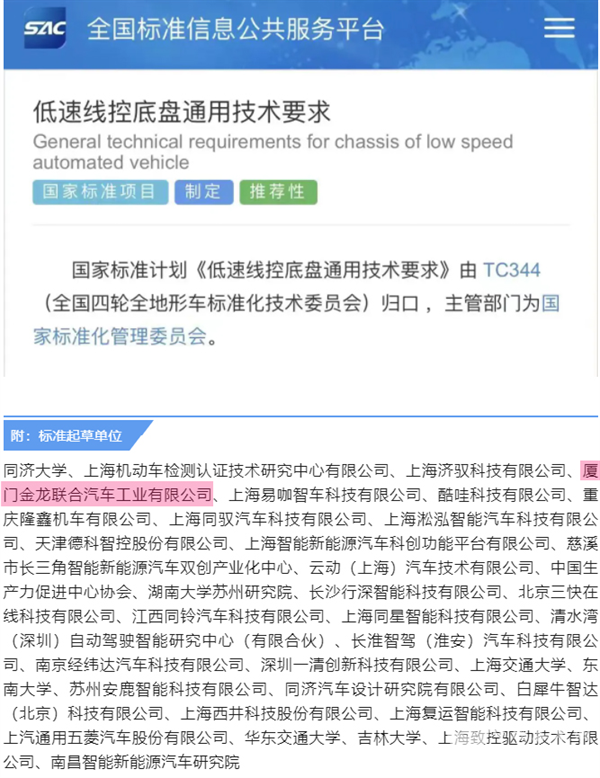 厦门金龙联合汽车工业有限公司参与起草制定首个线控底盘国家标准