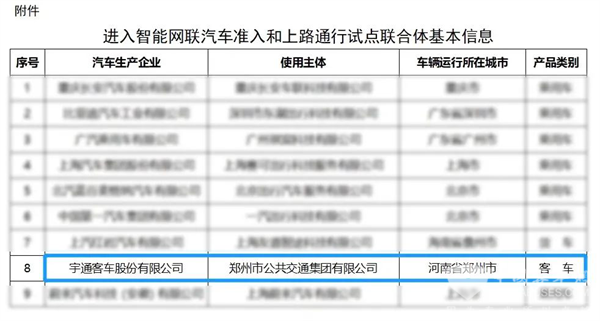 2024年6月4日,工业和信息化部、公安部、住房城乡建设部、交通运输部四部门联合公布《进入智能网联汽车准入和上路通行试点联合体基本信息》,宇通成为首批进入试点的唯一一家客车企业。