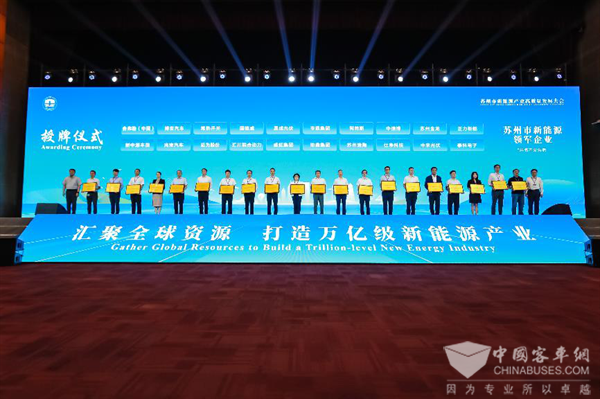 近年来,苏州坚持“双碳”目标牵引,积极抢抓新能源产业的发展风口,加快构建 “6+1”新能源产业体系,全力推动经济社会发展的绿色化、低碳化。在此过程中,苏州涌现出了以苏州金龙海格汽车为代表的一大批新能源龙头企业。在大会授牌仪式环节,苏州金龙党委书记、董事长陈笃廉代表企业上台领取“苏州市新能源领军企业”奖牌。