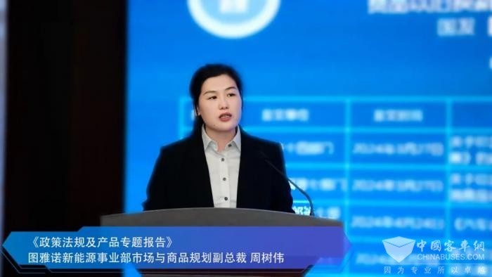 图雅诺新能源事业部市场与商品规划副总裁周树伟作《政策法规及产品专题报告》。报告中讲解了车辆的生产、登记管理、安全标准以及市场推广等相关政策法规,同时结合图雅诺产品做好梳理,启动2025年重点产品,为旺季做好准备。