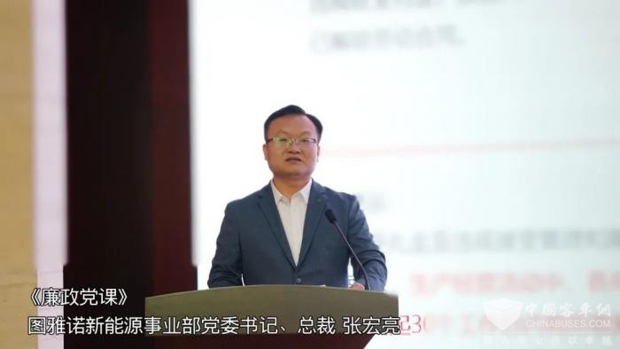 图雅诺新能源事业部党委书记、总裁张宏亮线上做《廉政党课》的报告。对北京市、市国资委、北汽集团、福田汽车警示教育大会主要精神作了传达,并组织全体与会人员学习廉政知识。