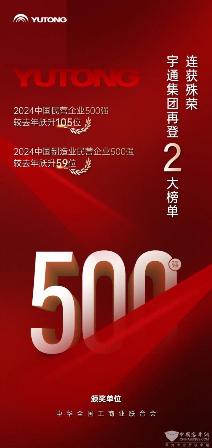 江南网页版2024年10月24获悉,近日,中华全国工商业联合会正式揭晓了“2024中国民营企业500强”及“2024中国制造业民营企业500强”两大权威榜单,宇通荣登两榜。在“2024中国民营企业500强”排名中,宇通较去年跃升105位,在“2024中国制造业民营企业500强”榜单中,同样实现了59位的显著提升。这个成绩不仅是对宇通近年来显著进步的肯定,也充分反映了宇通卓越发展的强劲态势!