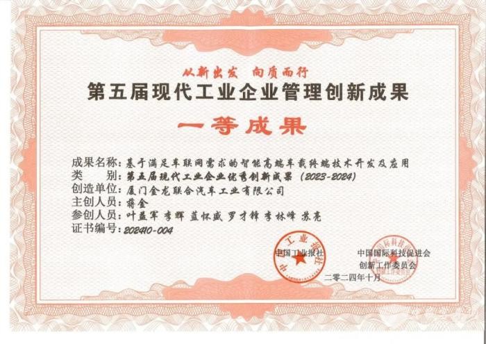 由厦门市工信局推荐厦门金龙联合汽车工业有限公司(以下简称“金龙”)的《基于满足车联网需求的智能高端车载终端技术开发及应用》项目成果荣获一等成果奖项,成为福建省唯一获此殊荣的企业,充分展现了金龙在新质生产力探索与发展中的创新实力。