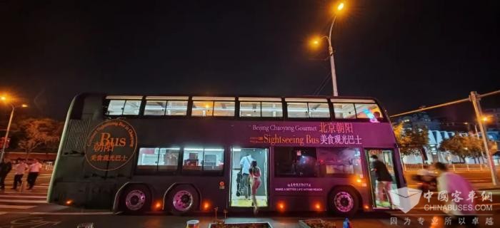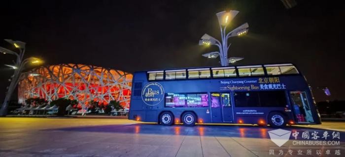 该观光巴士由北京市朝阳区推出,车辆基于安凯享誉国内外的双层观光巴士打造而来。整车设计高端时尚,车身醒目地印着“朝阳美食观光巴士”双语标识,与朝阳璀璨的夜景交相辉映,成为了一道流动的都市风景线。