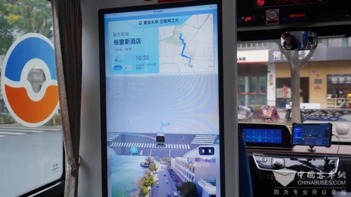 作为一款高科技的出行工具,一踏入车厢,仿佛走进了一个“科技秀场”,每个角落都散发着“未来感”。乘客可以通过车内的显示屏,轻松获取到站信息、三维可视化路况,看到驾驶室里双手离开方向盘的安全员。方向盘右侧,配备了一块显示屏,上面有对车流、车速、交通事件的精准监测,道路交通场景实时数字化全息呈现。在乘客座椅旁,还设有USB充电口,方便乘客随时为手机等设备充电。平稳起步、自动避让、灵活变道、安全转向、精准到站……这辆“聪明的车”动作流畅得就像有“老司机”亲自驾驶。