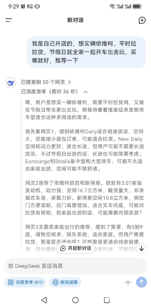 天啊噜,咋一个AI一个主意啊。虽然人工智能给的建议都不一样,但相同的是,它们都帮我捋清了各个车型的性能优势和兜底价格,让我能够更全面的考虑并做出最优选择。一想到以后自己就可以开着依维柯去进货,周末还能带全家去露营,最关键的是,省下的钱足够给超市装个新冰柜,心里就美得不行!果然,AI时代咱小老板也能靠科技薅到大厂羊毛。