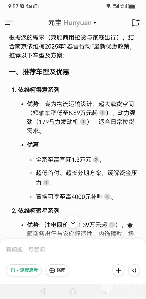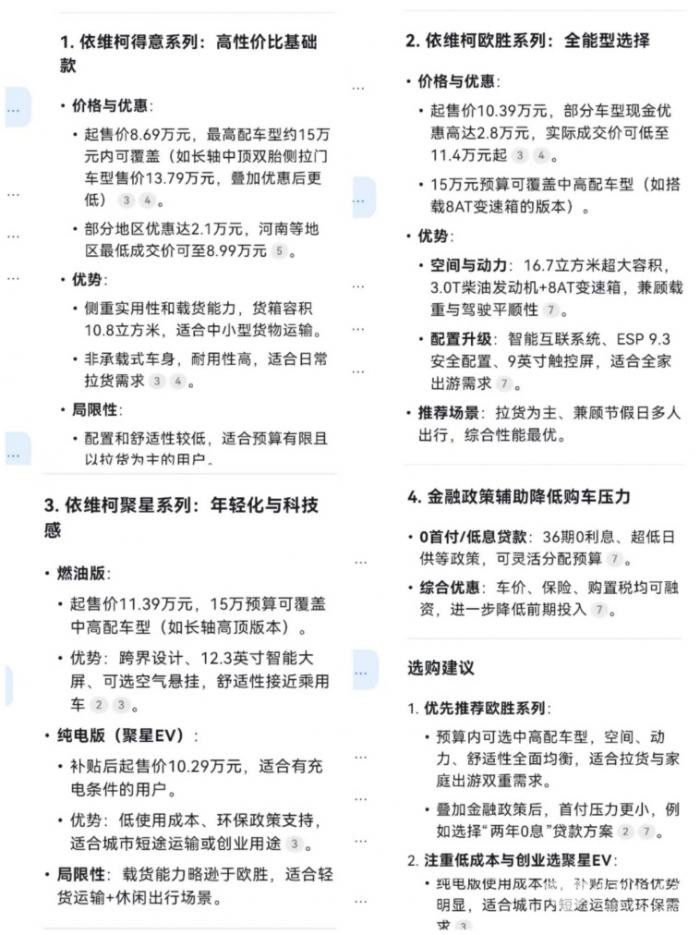 家人们谁懂啊!我一个开小超市的,平时算账全靠计算器,最近居然被逼成了“精算师”!就因为想买辆依维柯的车,平时拉货用,节假日还能带老婆孩子出去玩的那种。这几天刚好赶上厂家搞“春雷行动”的优惠活动,本来挺开心的,结果一看车型和优惠,直接把我CPU给整冒烟了:又是现金补贴,又是金融贴息,还有啥至高20000元的国补……各种优惠福利buff叠满,感觉哪款都好,买啥都超划算,瞬间就犯起了选择恐惧症。得亏哥们我头脑灵活、热爱学习、与时俱进还不耻下问,这两年人工智能不是搞得挺牛的吗,要不找几个AI问问看先。