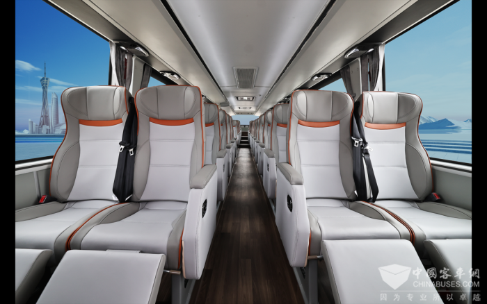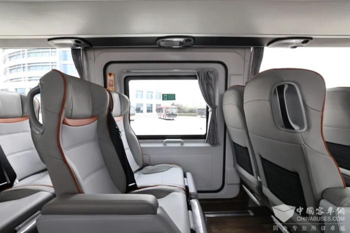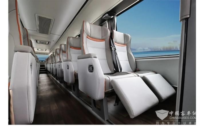 座椅带多项调节及腿托等功能,包裹性和支撑性都非常到位。可能有朋友会认为通常的座椅间距即使有舒适的座椅也伸不直躺不下,而在H13Pro上完全不用担心,因为座椅间距达到了870mm,即使是最后一排座椅靠背角度也可以达到135°,并且在如此间距下,车内依然可以布置49个座位,保证了车辆充足的接待能力。