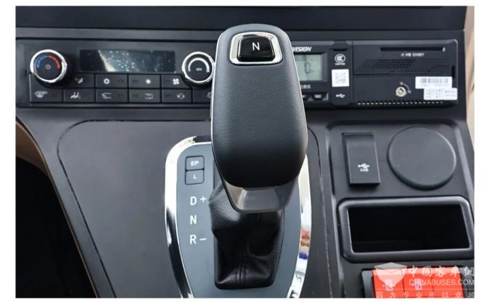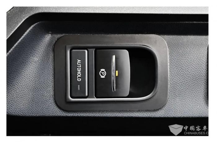鸡腿式自动挡手柄握感舒适,操控轻盈,除了常规的“D、R、N”挡位模式,左侧还具备E/P切换按键,方便驾驶员在空载或满员状态下对动力模式进行切换,促进整车节能。而电子手刹及自动驻车功能的加持,提升操控舒适性的同时,有效确保停车安全。