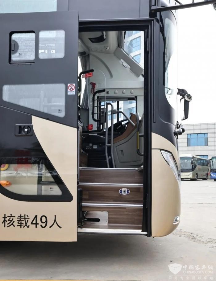 四级登车踏板进行了木纹地板及铝合金包边装饰,登踏踏实,彰显高端。自动门下方带大面积“OK窗”设计,可有效减小盲区干扰,提升车辆右转安全性。驾驶区工作台采用环形半包围设计,各种物理按键和操控开关触手可及。四幅式多功能方向盘大小适中,手感舒适,功能区集成了定速巡航、中控大屏操控等诸多功能,操作便捷。