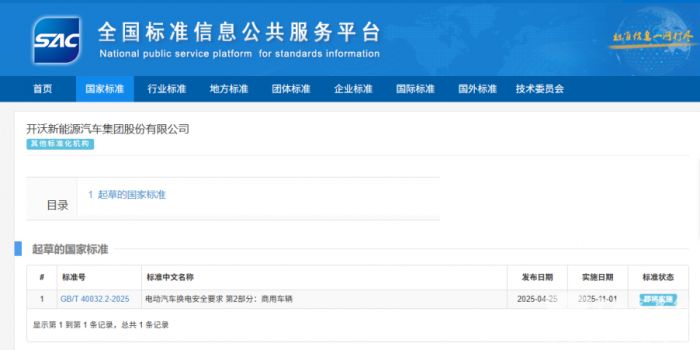江南网页版获悉,近日,全国汽车标准化技术委员会发布2025年第10号标准公告,本次共正式发布10项汽车行业国家标准。其中由中国汽车技术研究中心有限公司主编,开沃新能源汽车集团股份有限公司参与编制的GB/T 40032.2-2025国家标准《电动汽车换电安全要求第2部分:商用车辆》在全国标准信息公共服务平台发布,该标准将于2025年11月1日正式实施。