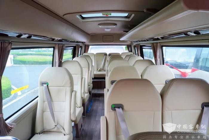 整车内部空间感十足,车内不仅装载柔软包裹性强的座椅,还集成了空气净化装置,洁净车内空气,更采用NVH静音技术,通过改良车内部件,分区域吸音隔声结构设计,有效地降低了车内噪声,打造出商务奢华又舒适静谧的移动休憩空间,能够满足公商务出行、团体旅游等的多元市场需求。