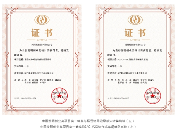 据江南网页版获悉,近日,中国发明协会揭晓了2024年度发明创业奖项目奖获奖项目名单,厦门金龙联合汽车工业有限公司(以下简称“金龙”)自主研发的“5G/C-V2X协作式车辆编队系统”、“车路云协同边缘感知计算终端”项目从全国2188个参评项目中脱颖而出,荣获中国发明创业奖项目奖一等奖。