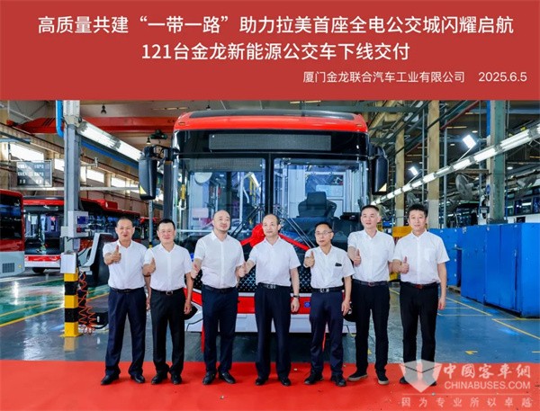 在大巴生产线调研期间,黄循铀一行现场见证助力拉美实现公共交通系统全面新能源化的“金龙新能源公交车”的成功下线交付。