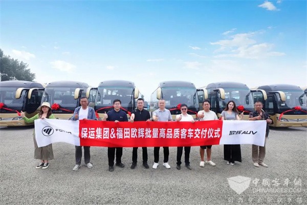 此次批量交付保运集团的 BJ6816、BJ6906 城间客车,是福田欧辉针对短途客运及旅游市场精心打造的精品车型,全部采用高顶设计,气势磅礴,凭借出色的性能、舒适的乘坐体验以及高效的运营效率,全方位满足企业对通勤班车及短途定线旅游的运营需求,助力创造更高运营价值。