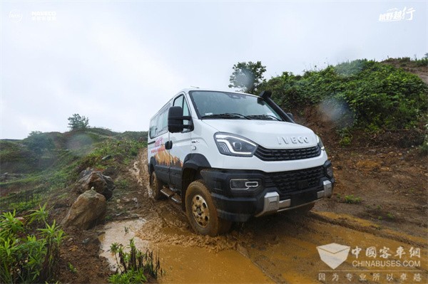 先谈谈我个人对这场依维柯欧霸·山海“越野越行——山海征途体验营”的感受吧。说实话,我已经很久没有如此酣畅淋漓地驾享自在越野的乐趣了。活动当日,天公作美,刚好下起了瓢泼大雨,当我驾驶着欧霸·山海碾过积水路段时,F1C 3.0T发动机的轰鸣瞬间撕裂了雨幕,132kW功率与430N·m扭矩的爆发力,通过全时四驱系统化作四轮下翻涌的泥浆,全地形AT轮胎的深齿纹如同猛兽利爪,在湿滑的路面上犁出两道黑色轨迹,底盘与悬挂系统默契配合,将颠簸过滤成连绵的起伏,仿佛坐在移动的磐石之上,当车辆以近乎匀速的状态贴着坡面滑行时,你甚至能够听到泥浆被轮胎绞碎的声响,这是机械与物理法则博弈的配乐,而胜者,是依维柯欧霸·山海对越野性能的绝对掌控。