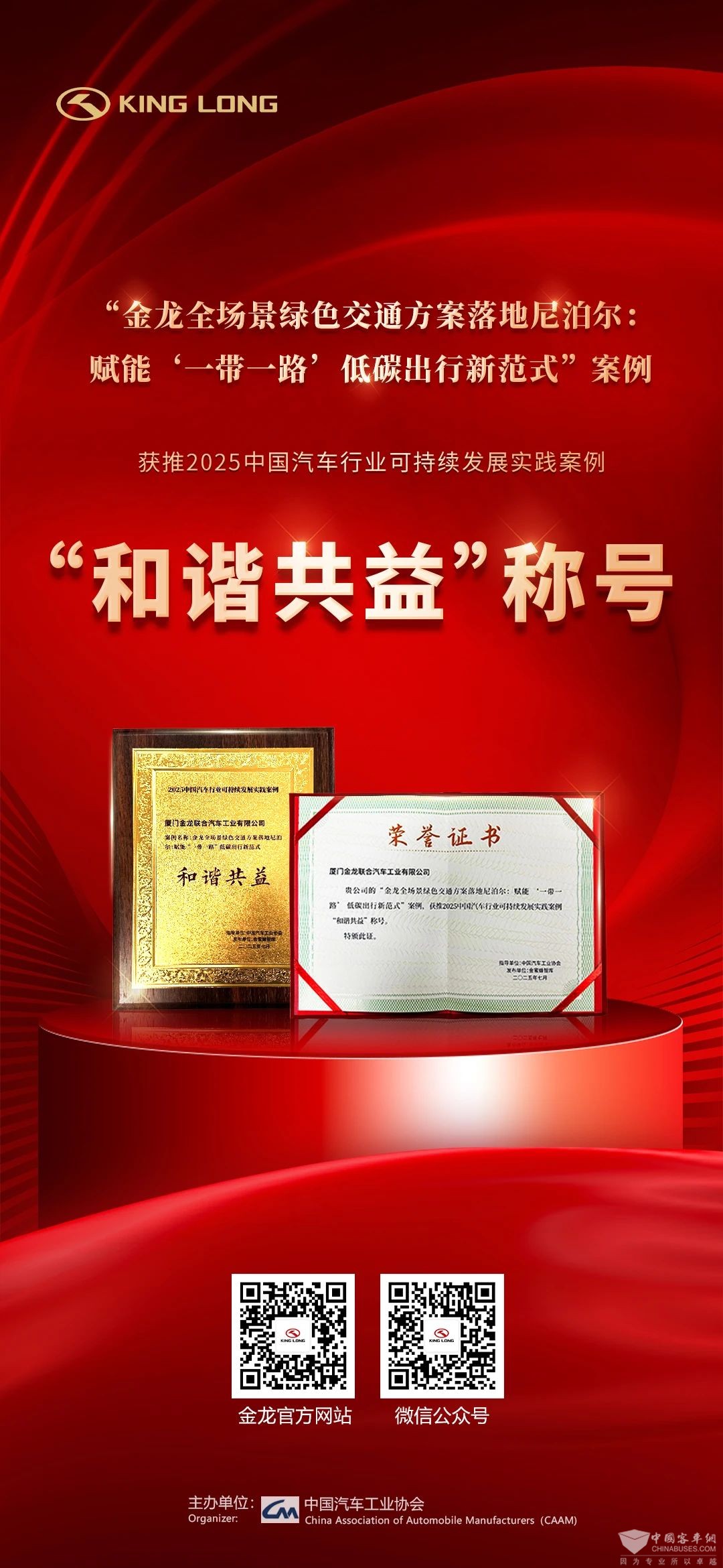 金龙:荣获2025中国汽车行业可持续发展实践案例“和谐共益”称号!