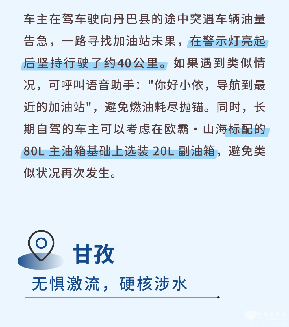 欧霸·山海在80L主油箱上选装20L副油箱,避免油量突然告急;全方位底盘防护系统保证涉水,搭配新一代F1C 3.0T发动机,表现出色。