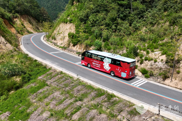 一辆安凯红色N12大巴车正穿行于苍翠山峦间,搭载着寻访者驶向大别山深处的抗战记忆。
