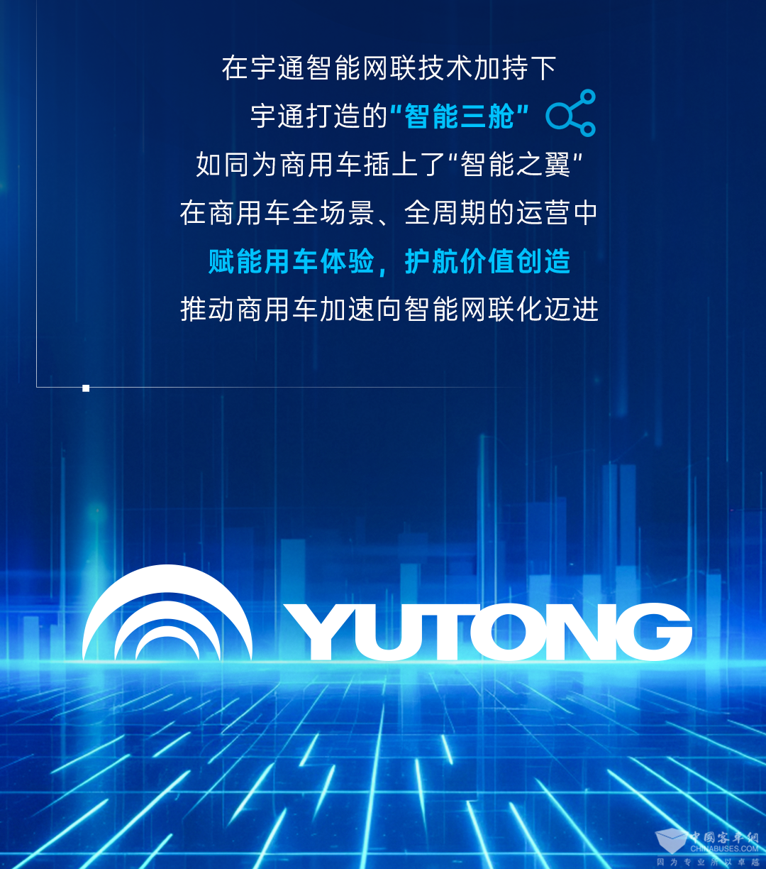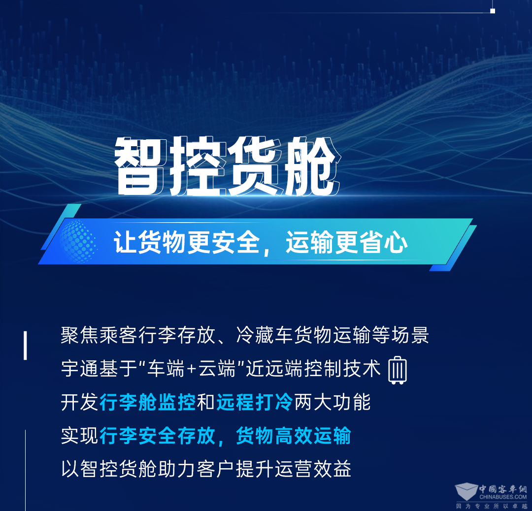 宇通三舱的黑科技包括智慧驾舱、智享客舱、智控货舱。智慧驾舱采用一芯多屏技术,支持开关记忆;客舱支持智能遥控功能和高保真音响;货舱内实现行李舱监控和远程打冷功能。