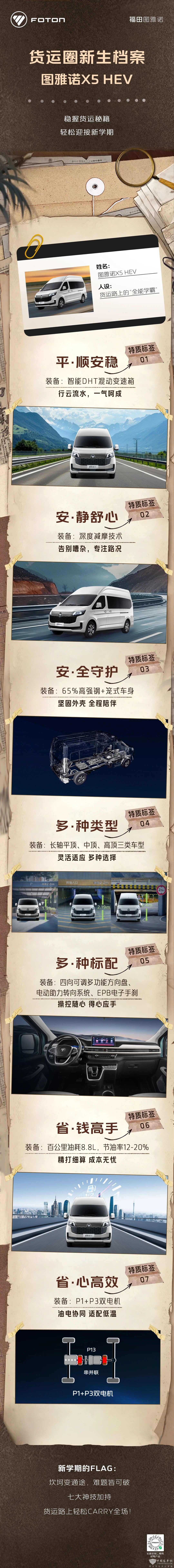 货运新客车图雅诺X5 HEV装备智能DHT混动变速箱,行驶平稳,深度减摩技术减少噪音,高强钢车身守护安全,有多种类型和标配选择。