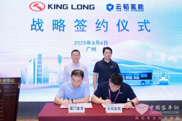 展会同期,金龙与云韬氢能正式签署战略合作协议,共推氢燃料公交发展。金龙深耕行业多年,品牌价值与技术实力行业领先,M系列车型市场认可度高;云韬氢能是华南地区装机规模最大的氢燃料电池企业,全产业链布局完善、技术优势显著。