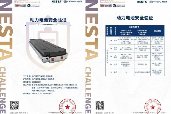 相关测试主要针对新能源商用车动力电池五大核心风险——长期颠簸结构失效、深度涉水短路、外部火源爆燃、重大事故撞击、单体热失控连锁反应等,以远超国家最新标准《电动汽车用动力蓄电池安全要求》(GB38031-2025)3-7倍的强度,完成了覆盖全维度的极端工况测试,并取得优异成绩。凭借这一表现,福田爱易科也成为国内第一个通过中汽研动力电池安全NESTA验证的商用车动力电池品牌,为行业树立了安全新标杆。