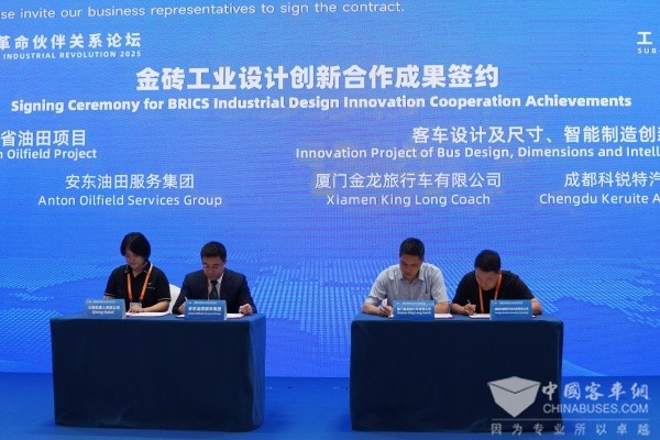 九月的鹭岛,海风送爽,群贤毕至。为期两天的2025金砖国家新工业革命伙伴关系论坛在厦门隆重开幕,来自34个国家和国际组织的代表齐聚一堂,共谋发展大计,奏响“大金砖合作”时代强音。在这场产业对接、共商合作的盛会期间,金旅客车与成都科瑞特汽车科技有限公司在参会领导、嘉宾和媒体记者的见证下签署战略合作协议。双方联合推出的“客车设计及尺寸、智能制造创新项目”,作为金砖工业设计创新合作成果的典型案例发布,不仅是企业间优势互补的强强联合,更是金砖国家产业协同设计赋能的生动实践。