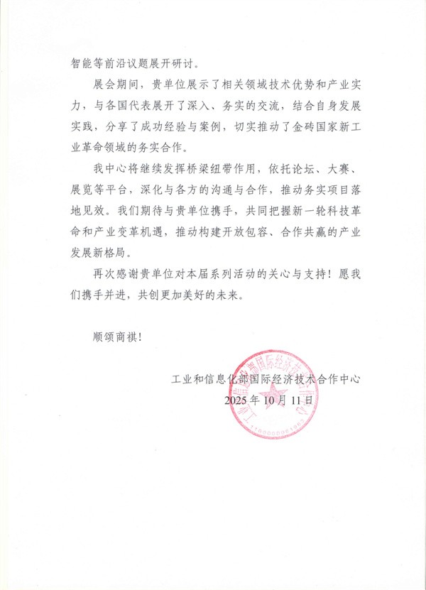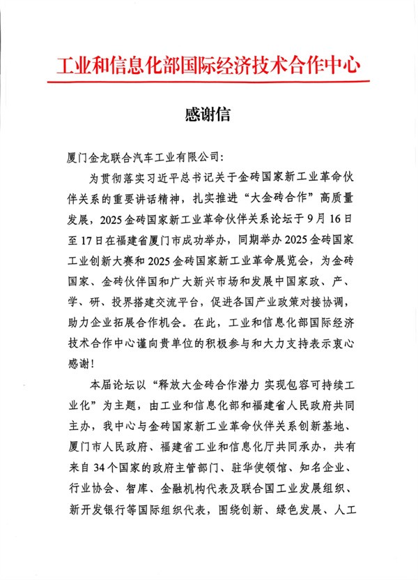 2025年10月22日,工业和信息化部国际经济技术合作中心向厦门金龙联合汽车工业有限公司(以下简称“金龙”)发来感谢信,对金龙在2025金砖国家新工业革命伙伴关系系列活动中的支持和突出表现致信加冕。信中对金龙在活动期间展现的技术优势、产业实力及务实交流成果给予肯定,为金砖国家政、产、学、研、投界交流搭建桥梁、推动新工业革命领域务实合作,充分彰显了中国自主客车品牌的国际影响力。