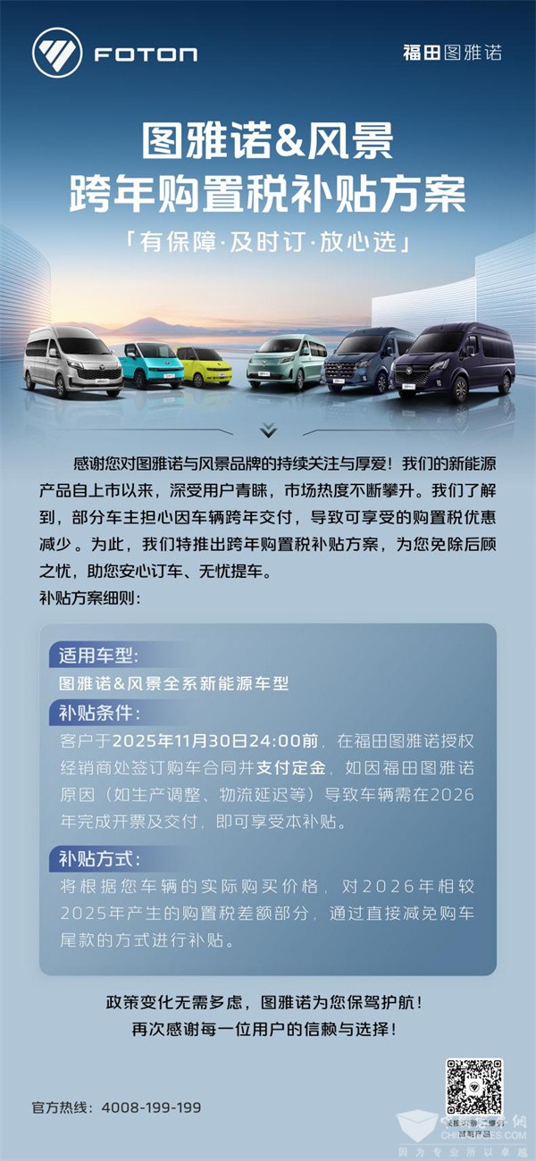 补贴条件:于2025年11月30日24:00前,在福田图雅诺授权经销商处签订购车合同并支付定金,如因福田图雅诺原因(如生产调整、物流延迟等)导致车辆需在2026年完成开票及交付,即可享受本补贴。