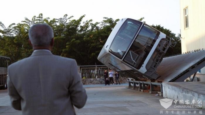 下午3时,在金旅侧翻试验台前,Clive Chirwa教授与金旅工程师团队一同屏息凝神,观看试验的进行。此次侧翻试验旨在模拟车辆在极端侧翻情况下,车身结构对乘员的安全保护能力,是检验客车被动安全性的关键环节。