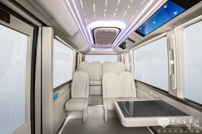 内饰方面,欧辉智能巴士创新采用环抱式座舱、一体化侧围、隐藏式空调出风口等乘用车化设计,融入悬浮式功能桌、车载冰箱、定制咖啡机等高端配置。加宽沙发式座椅,甄选纳帕超纤皮,贴合人体工学;顶部悬吊顶内饰,搭配透光流水氛围灯,营造出开阔明亮的乘坐环境,完美适配商务会晤等多元场景。