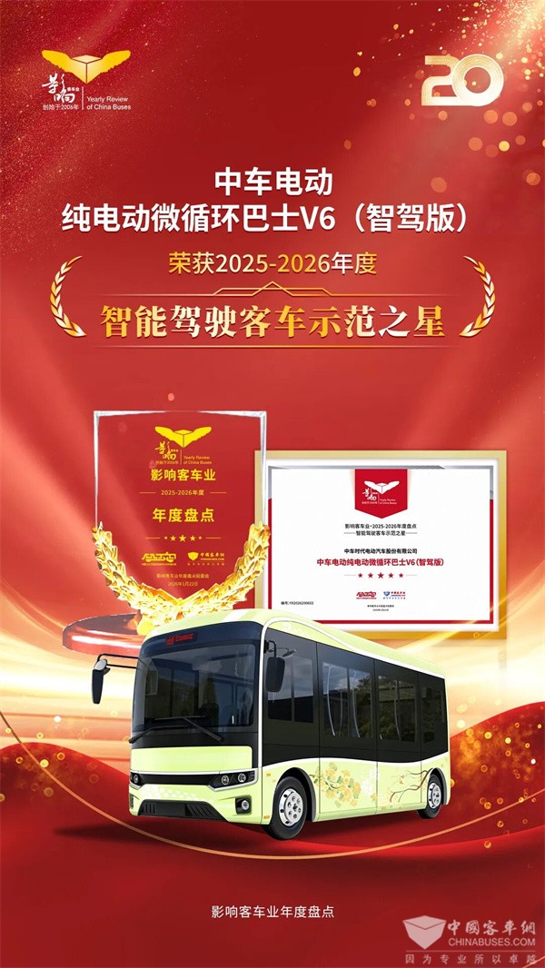二十载深耕沉淀,影响客车业年度盘点活动早已成为中国客车行业极具公信力与影响力的年度标杆盛事。活动聚焦年度行业亮点,遴选卓越产品与创新技术,为行业发展树立风向标。本次中车纯电动微循环巴士V6(智驾版)在一众参评车型中崭露头角、实力突围,一举拿下 “智能驾驶客车示范之星” 荣誉,既是行业专家对其产品硬实力的专业认可,更是市场对其领跑微循环细分领域的高度肯定。