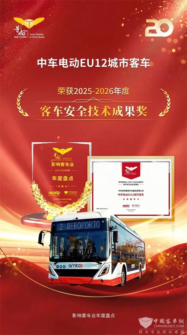 载誉而来,耀领新途。1月22日,行业盛事第20届影响客车业年度盘点活动圆满落幕,中车电动两款客车产品分别斩获2025-2026年度“智能驾驶客车示范之星”和“客车安全技术成果奖”两项大奖。