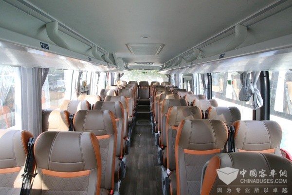 提及新V系客车的特点,陈海涛认为该批车型在细节服务上的改进尤为突出,充分满足了客户需求。苏州金龙根据阳光e旅需求,为车辆配备了双色皮革座椅,兼顾美观与耐脏性;在车辆出厂前预先完成车辆标识粘贴,并将驾驶室窗帘升级为高铁式设计,还增配了供司机夏季使用的小风扇;冬季车内还采用热泵空调加热,升温能力显著提升。此外,柴油版新V系还采用铝合金轮毂和高性能变速箱,进一步增强安全性与驾驶舒适性。