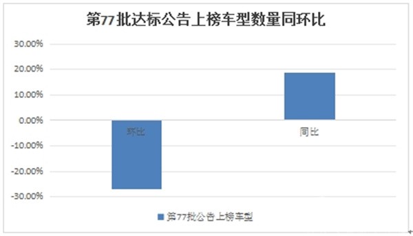 第77批达标车型公告上榜数量同比增长18.6%,据分析主要是因为去年同期及上一批公告上榜数量较少,给本批次公告上榜数量同比增长,奠定了基础;环比之所以下滑27.1%,主要是上一批公告上榜的数量较多(是近期以来少有超100款车型的批次),给本批次公告上榜车型数量环比增长带来压力。