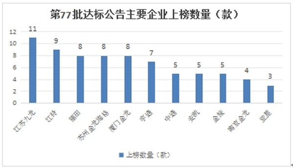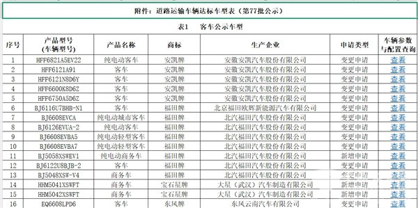 上图可见,在交通部第77批上榜的达标的道路运输客车车型公告中: