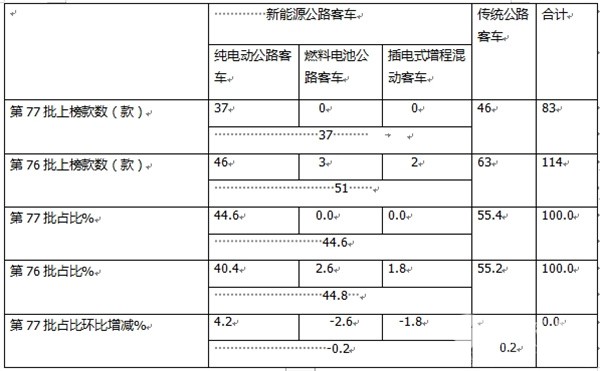 表1,第77批交通部达标车型公告上榜的各动力车型数量、占比与上一批环比(数据来源:交通部)