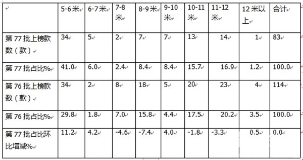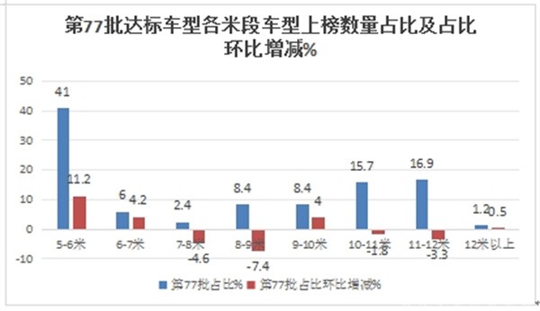 表2,根据交通部数据,第77批客车达标车型公告中上榜的各长度段车型数量、占比比及环比增减统计: