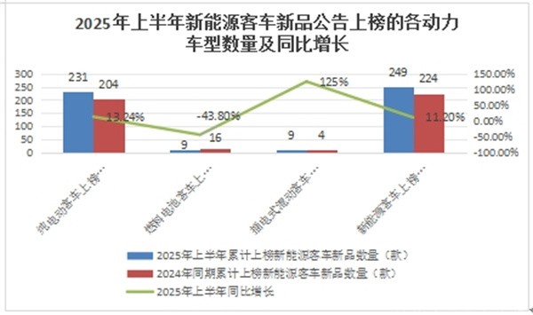 据统计,2025年上半年6个批次的新能源客车公告累计上榜了249款新能源客车新品车型(含231款纯电动客车、9款燃料电池客车和9款插电式混动客车),比去年同期的224款增长11%。