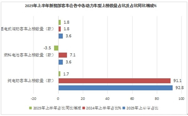 上图表显示,在2025年上半年6个批次的公告中,各技术路线新的能源客车上榜数量及占比、占比同比增减呈现以下特征: