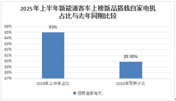 根据工信部数据统计,在2025年上半年上榜的249款新能源客车新品中,搭载自家品牌电机的占比为95%,比2024年上半年的近90%(89.9%)提升近5个百分点。