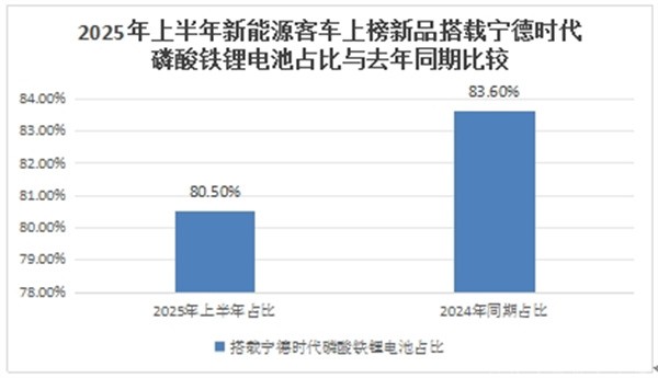 根据工信部数据统计,2025年上半年上榜的249款新能源客车新品中,搭载宁德时代磷酸铁锂电池占比80.5%,占比同比下降近3个百分点。